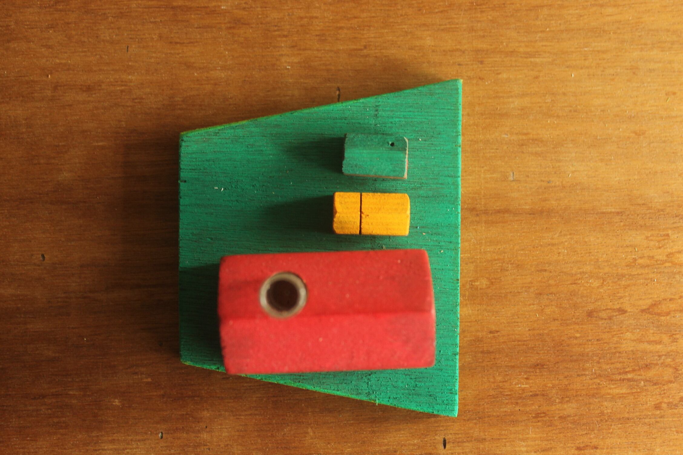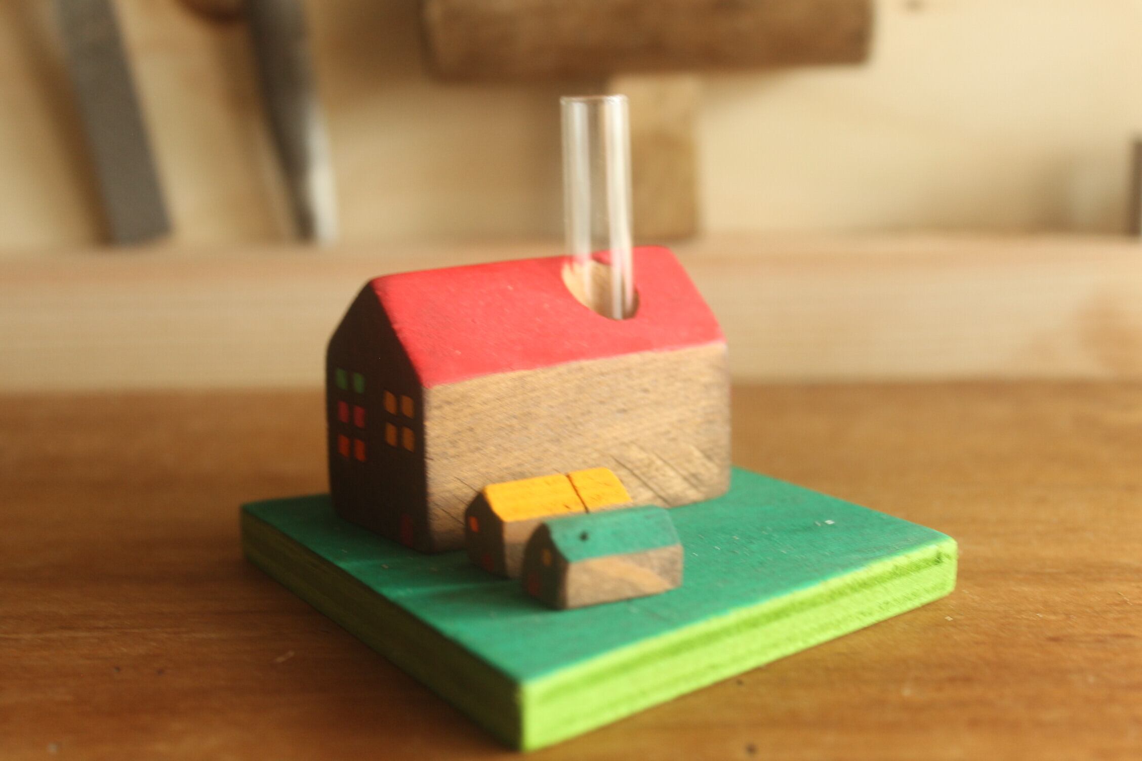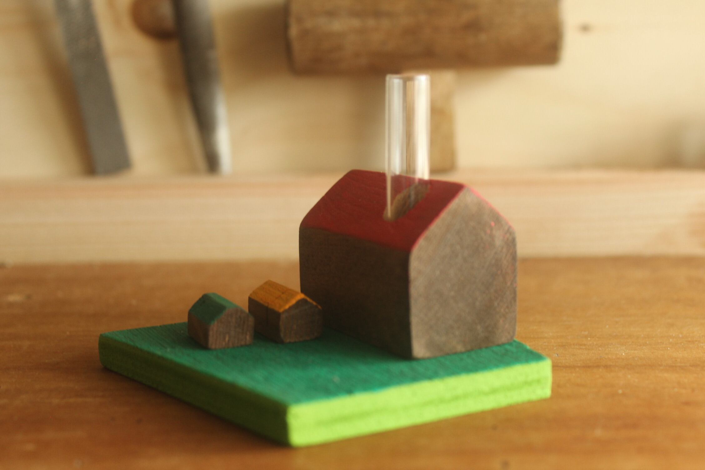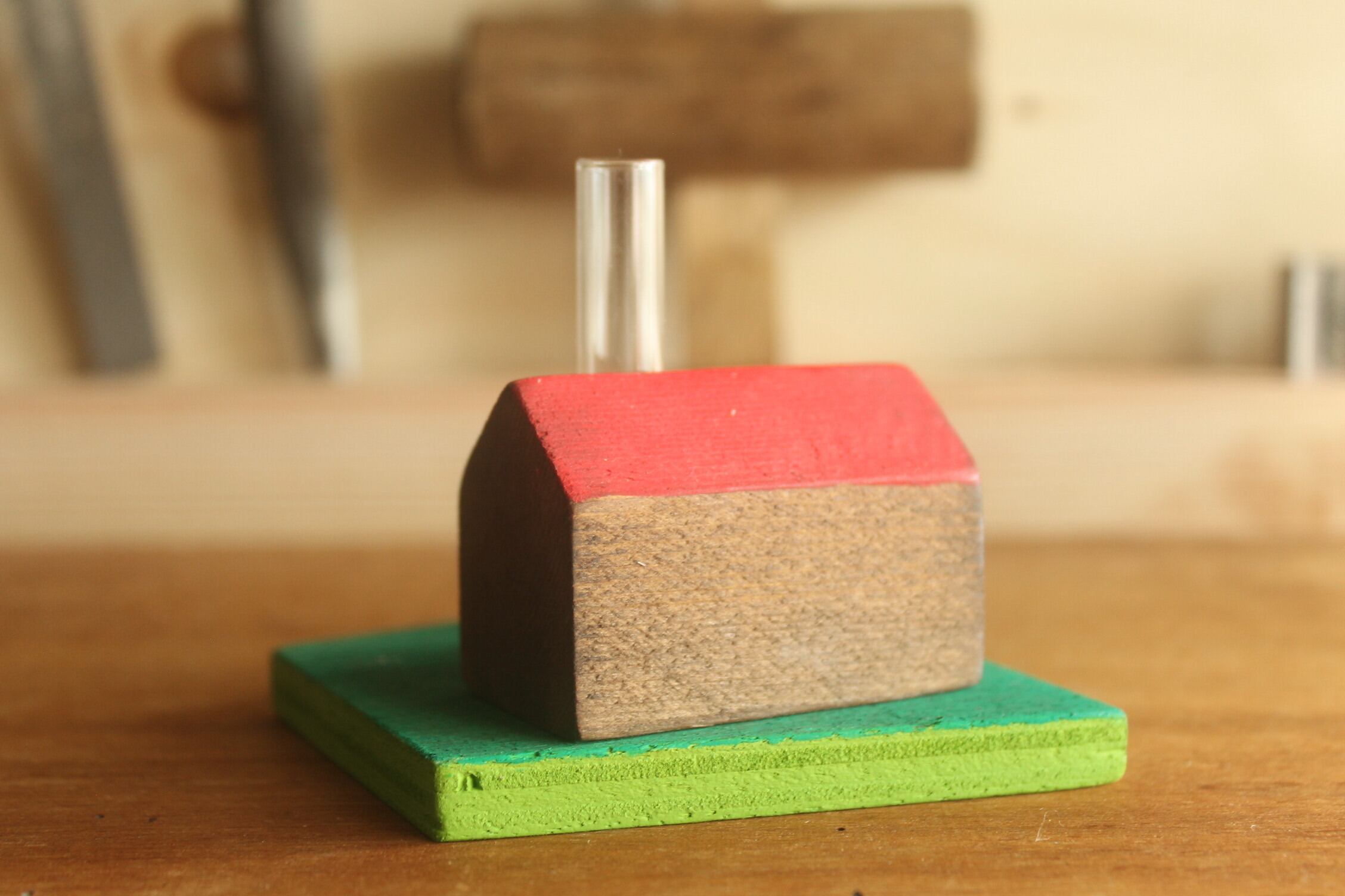 屋根に切れ込みの入った家は、カード立てです。小さな写真や、メモをはさんだり、または葉っぱを差したりと、さまざまに使えます。
