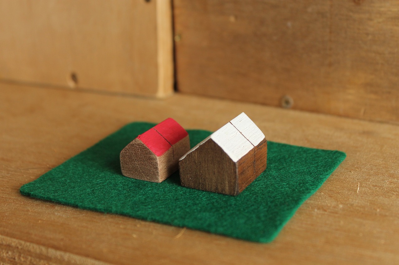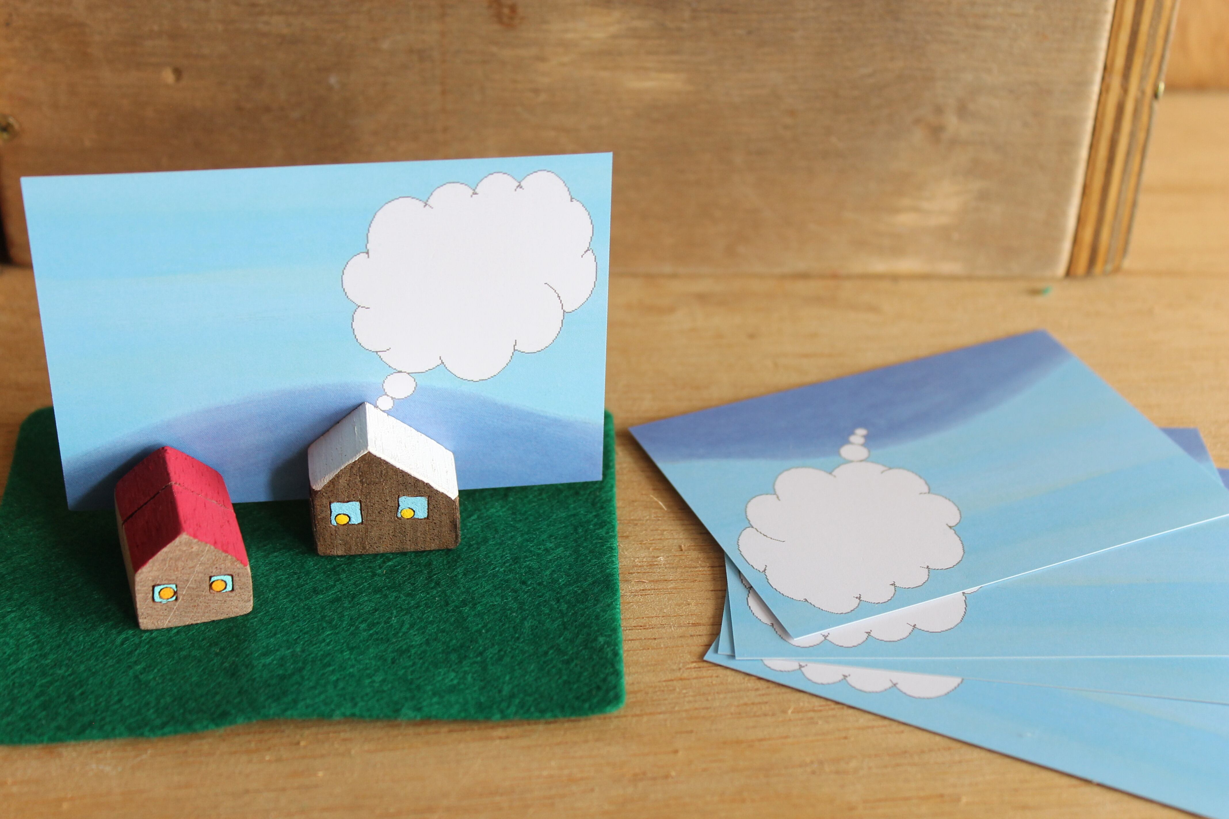 家二軒と、芝生に見立てたフェルト一枚、吹き出し入りのメッセージカード5枚のセットです。